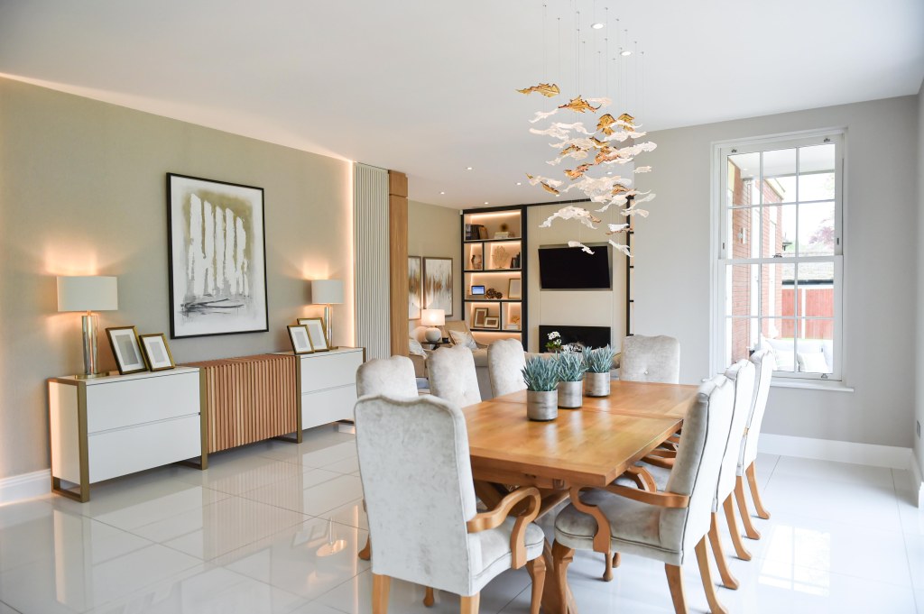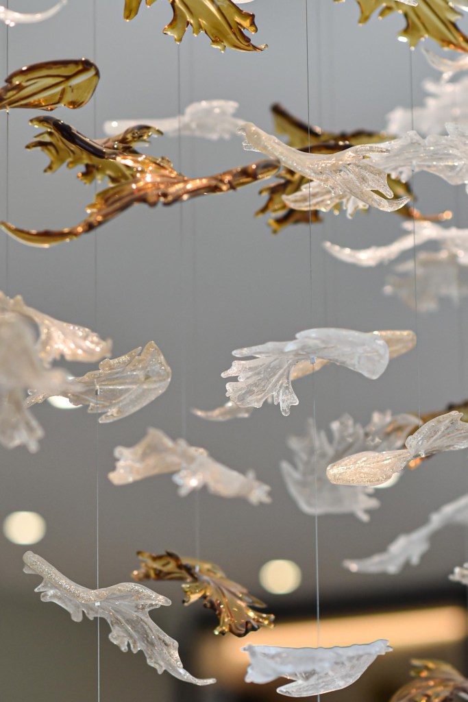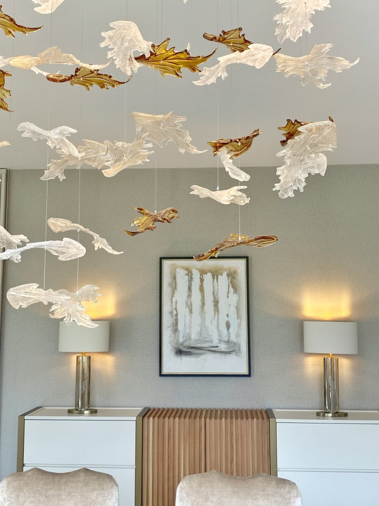 The dining area is crowned with a stunning chandelier featuring crystal leaves in three distinct tones, adding a touch of luxury and acting as a striking focal point over the dining space.