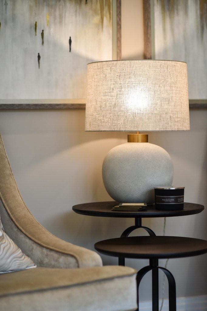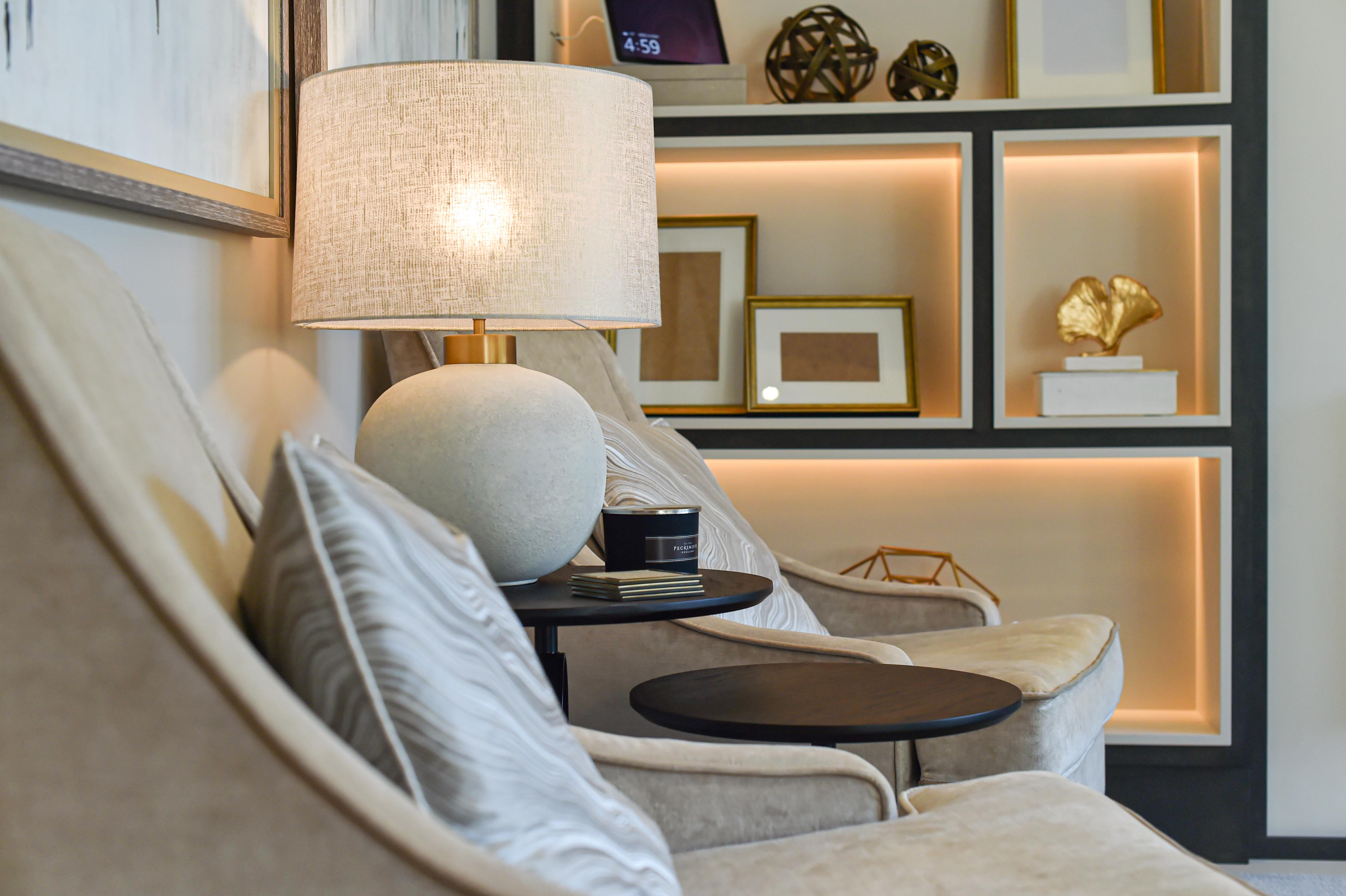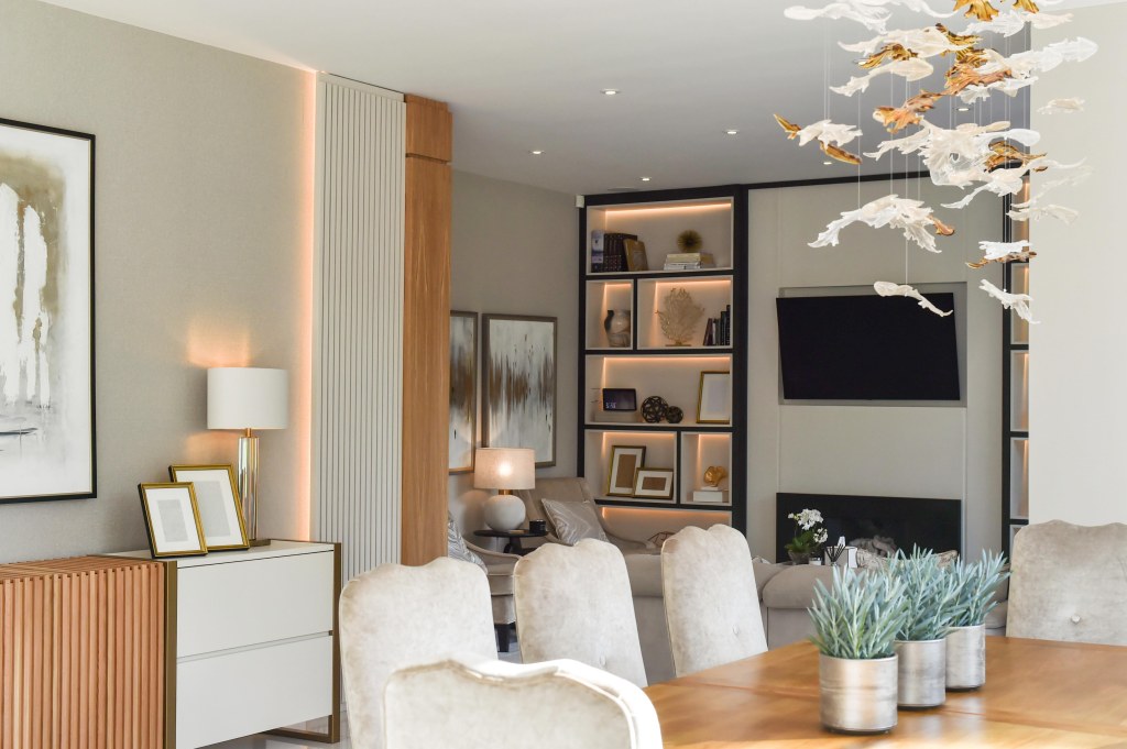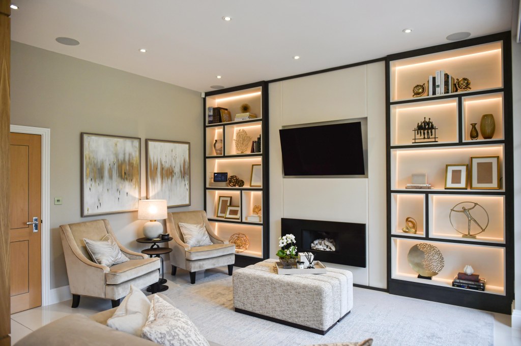 The fireplace was updated with a dark, modern frame, while indirect lighting highlights a feature wall adorned with elegant wallpaper. A bespoke TV unit adds visual intrigue, using contrasting black and cream tones for a layered, dynamic focal point.