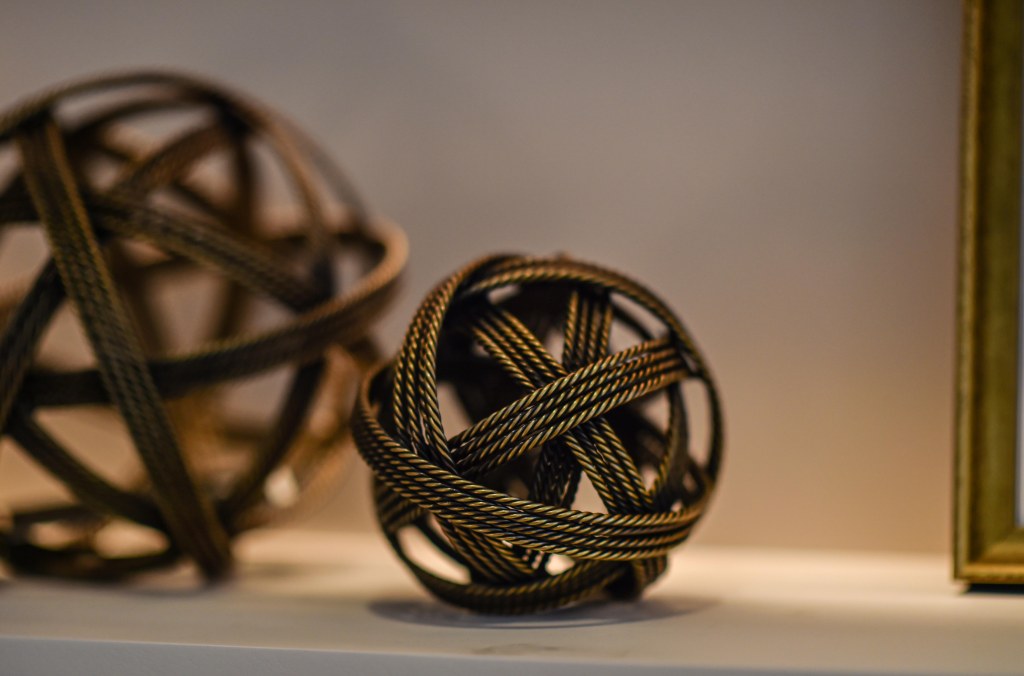 A striking custom-made sideboard, stretching over three meters, stands out with its slatted elements and brass accents, harmonising with the oak finishes in the dining table, chairs, and door frames.