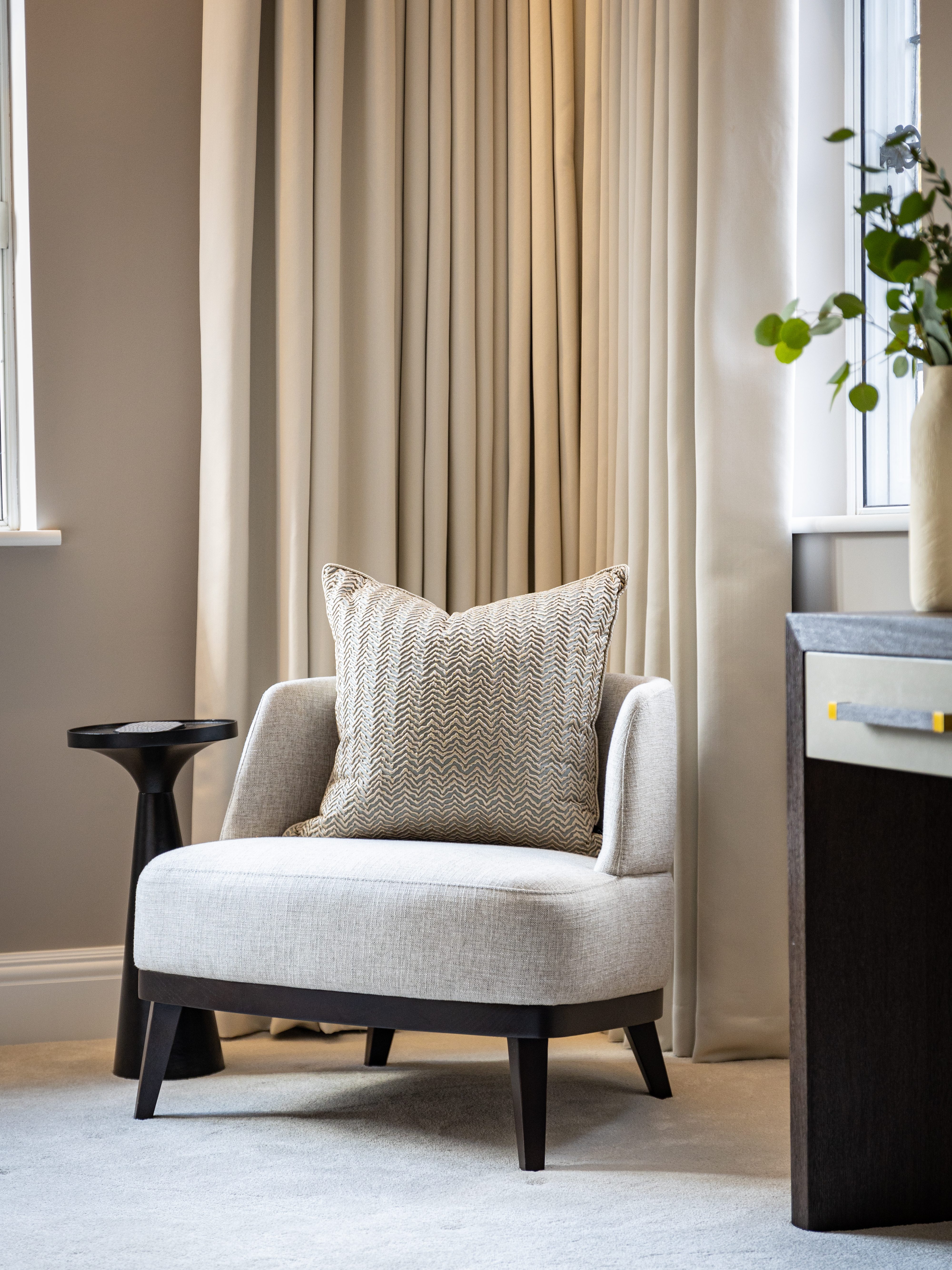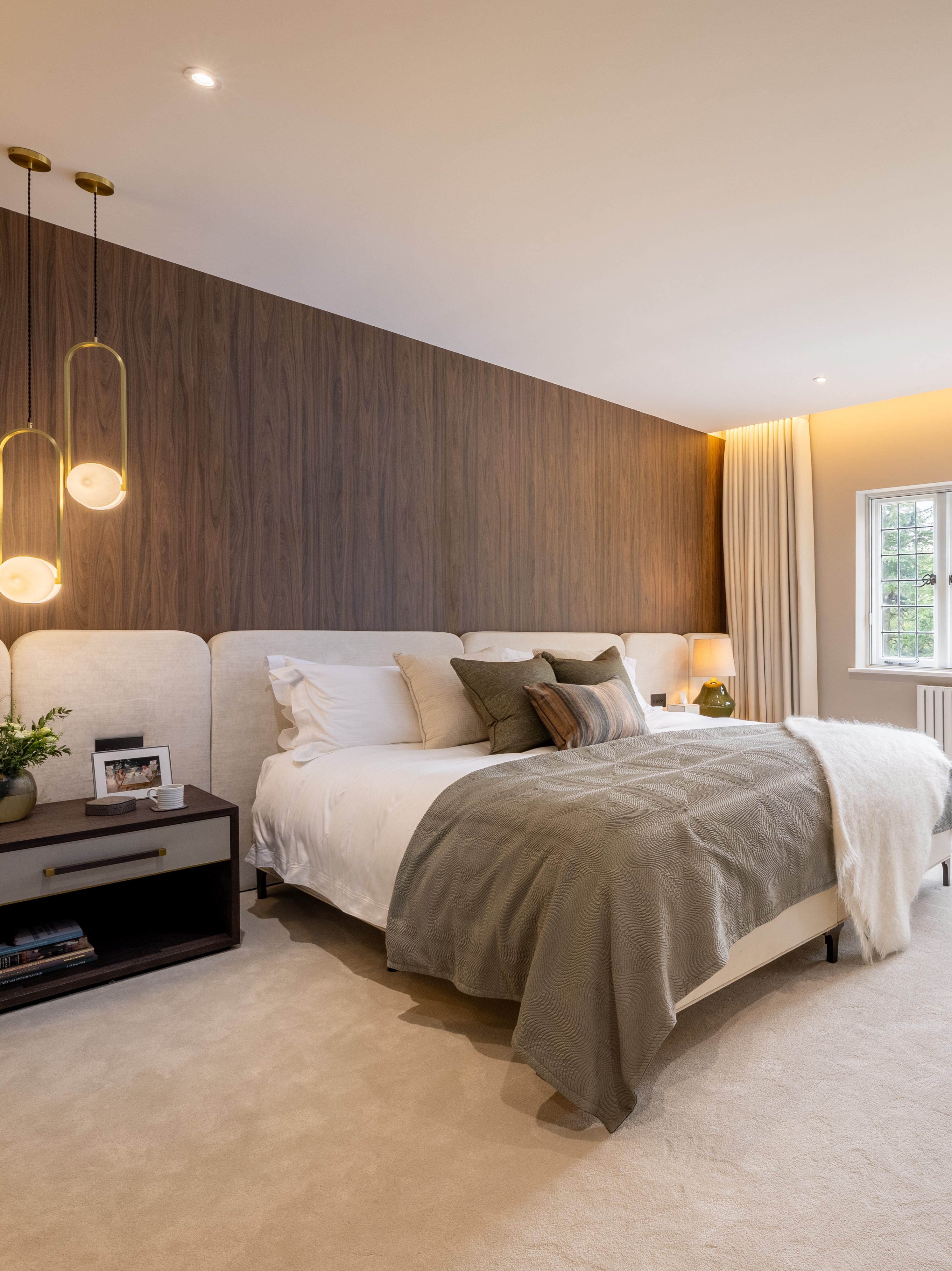 This contemporary master bedroom is designed to be a peaceful retreat, combining stylish features with a cosy atmosphere.