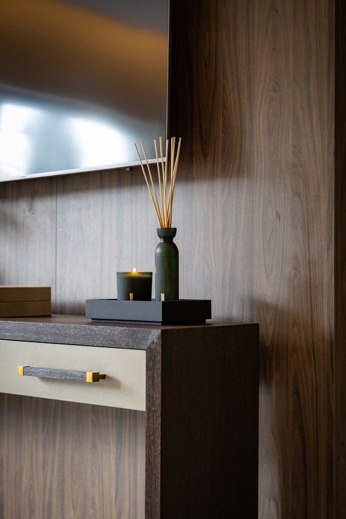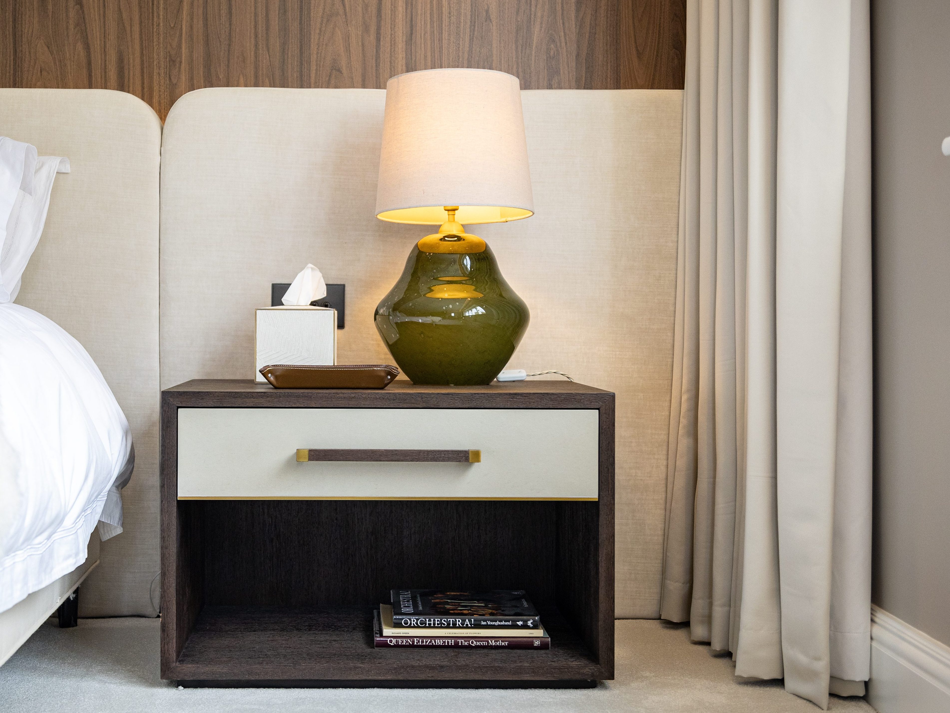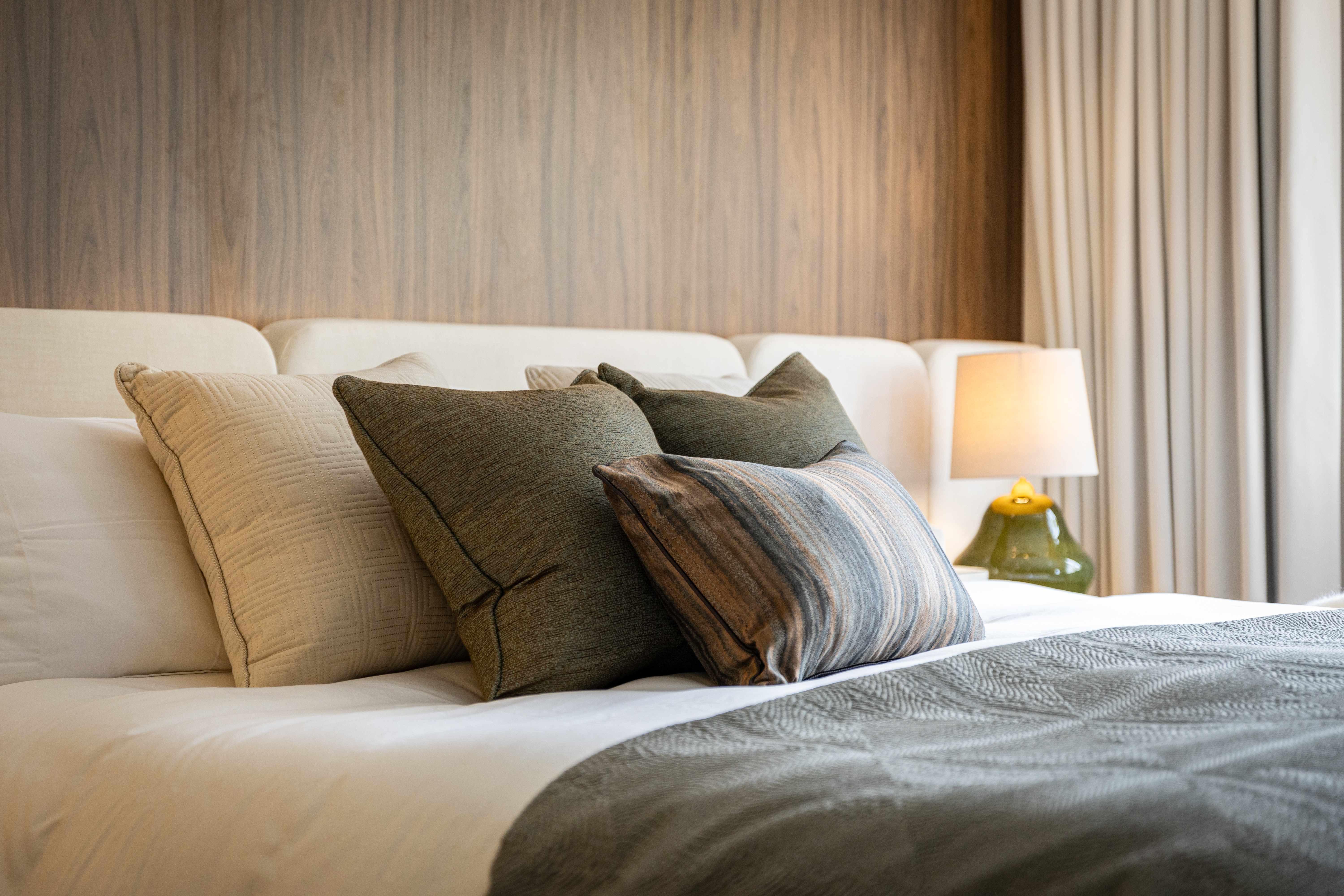 At the heart of the room is a stunning upholstered headboard. Its luxurious feel is beautifully complemented by rich wooden finishes, which add warmth and depth to the design. Soft, indirect lighting highlights the headboard, creating a warm, inviting glow that makes the space feel like a true sanctuary.