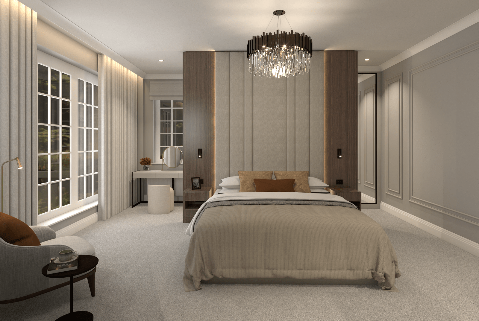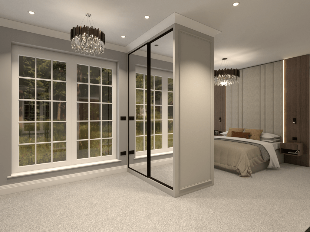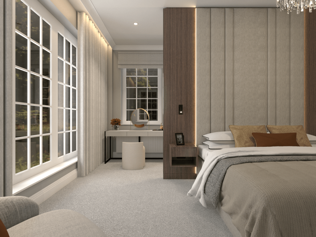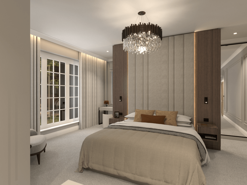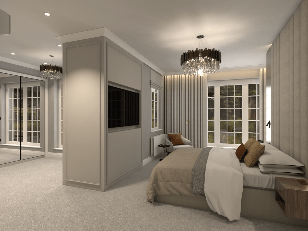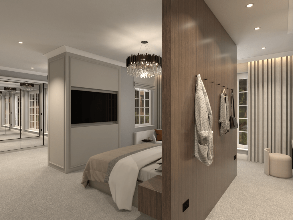 Our innovative layout was critical to the transformation. By reimagining the space, we introduced a generously sized wardrobe tucked behind an impressive headboard, which adds a sense of grandeur while discreetly concealing storage. This dual-purpose design not only saves space but elevates the room’s sophistication. Another wardrobe integrates a sleek TV, merging entertainment with tranquillity and offering a streamlined solution that fits seamlessly into the new aesthetic.