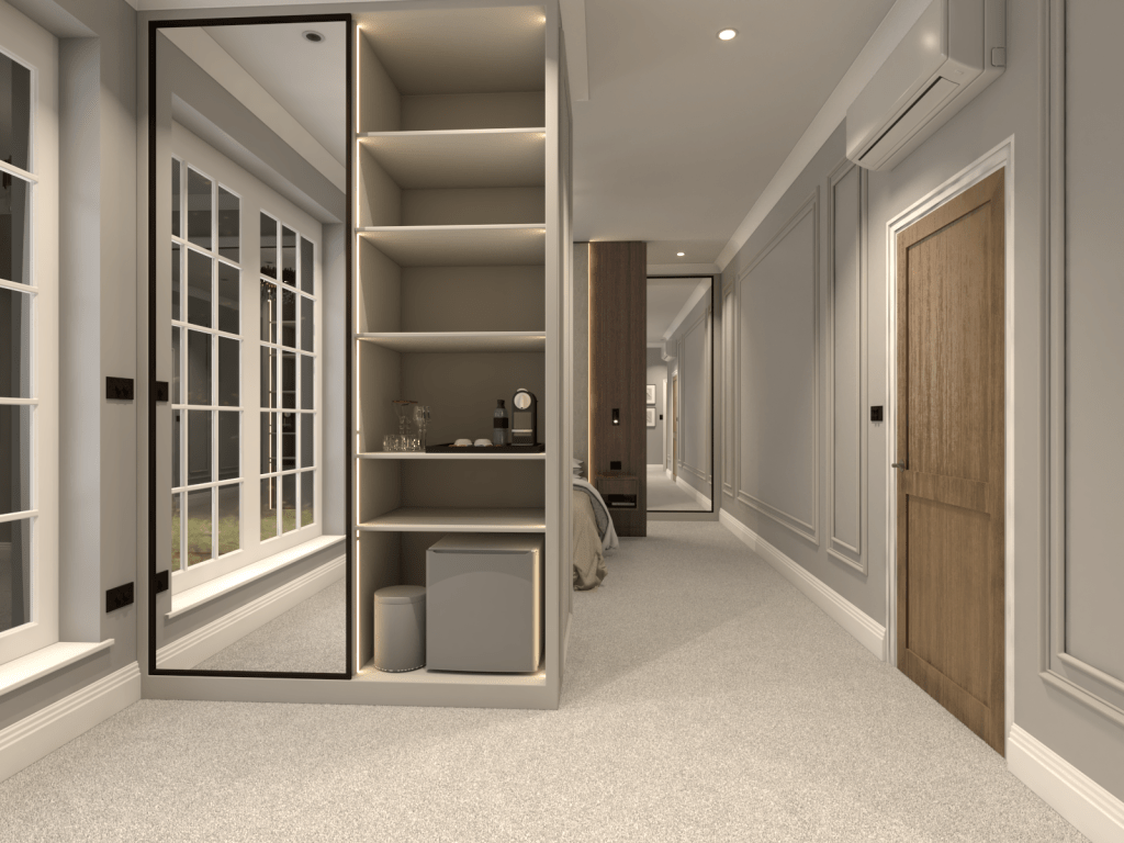 In a nod to indulgence, we responded to our client’s requests by incorporating a mini fridge within one of the wardrobes. This hidden addition offers convenience without compromising style, allowing easy access to refreshments while maintaining the room’s serene look.