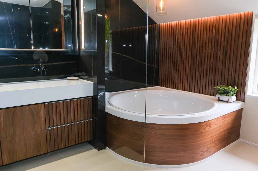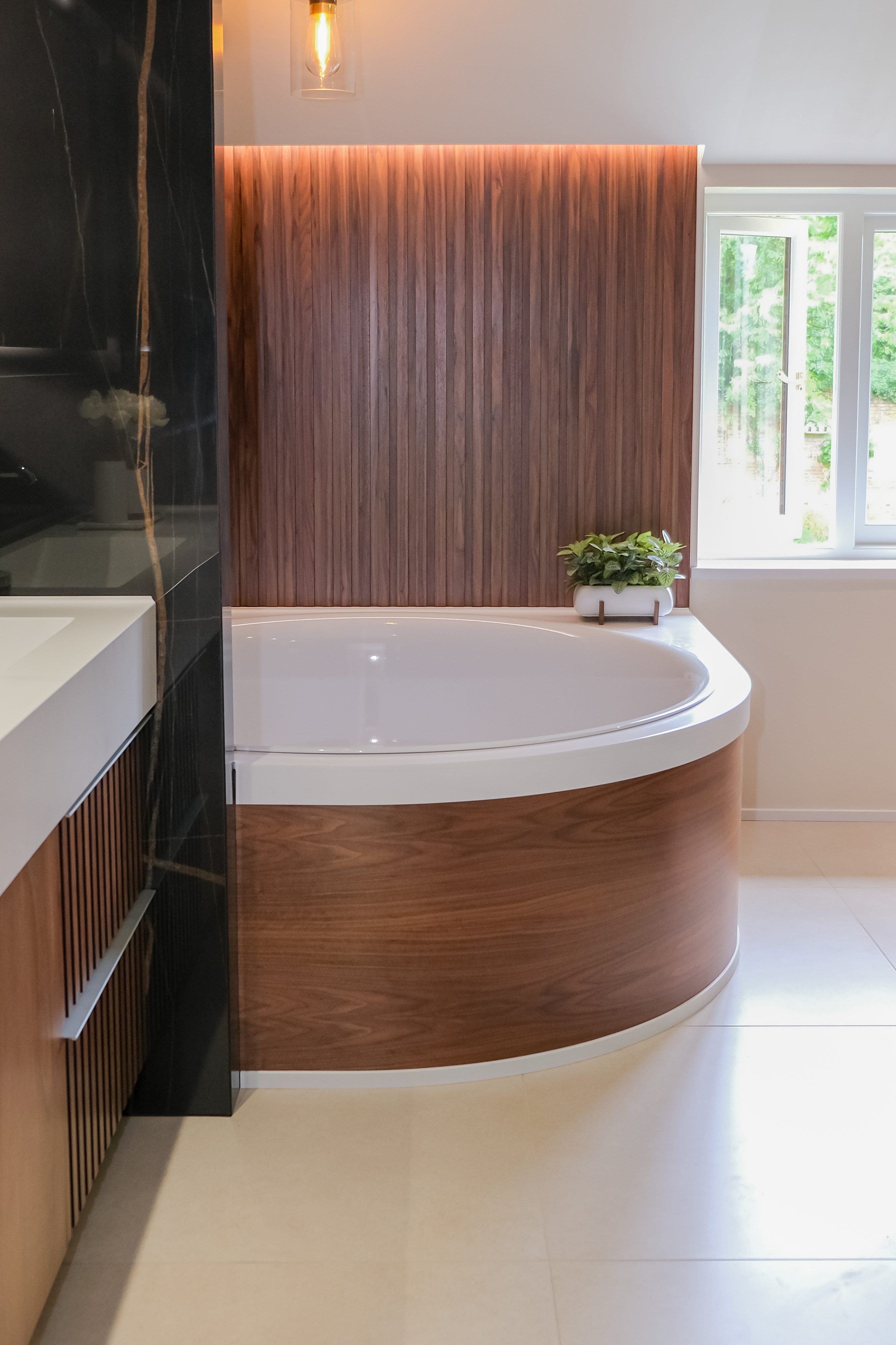 Warmth and texture are introduced through bespoke wooden cabinetry and wood panelling, which frame the freestanding bath and highlight the feature wall behind it. This natural wood finish adds an inviting, organic touch to the space, complementing the modern elements and balancing the overall aesthetic.