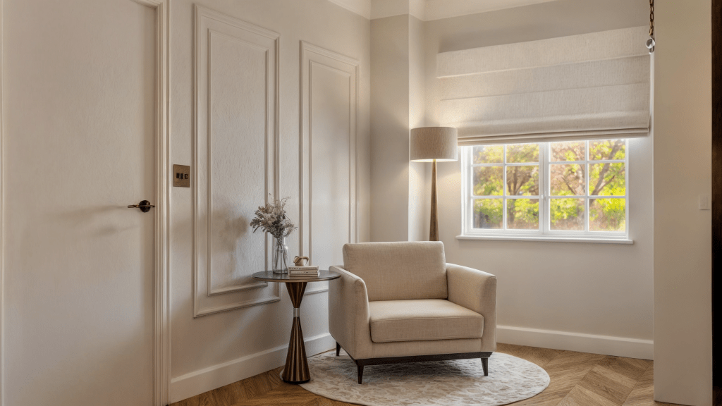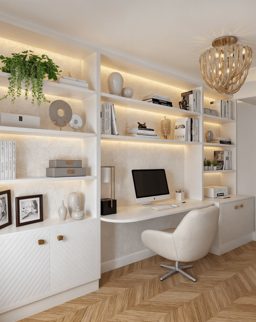To create a perfect balance between work and relaxation, we planned a cosy seating area by the window. This quiet nook is an ideal spot to unwind, read, or take a break, enhancing the overall functionality and comfort of the home office. The thoughtful design elements and luxurious touches transform this space into an inspiring and tranquil retreat.
