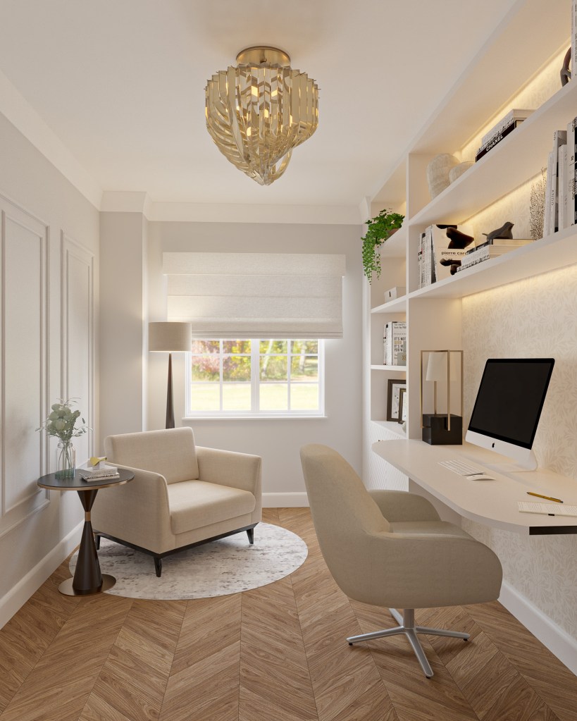 This home office project combines a neutral and light colour scheme to create a serene and calming environment, perfect for productivity and focus. The carefully selected palette of soft tones enhances the feeling of openness and tranquillity in the space.