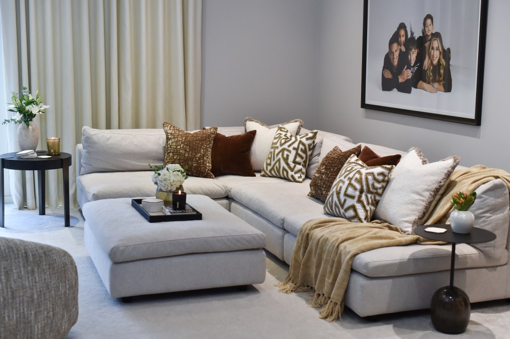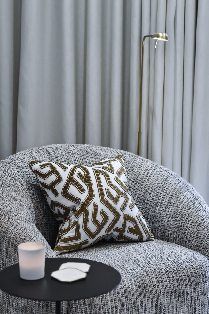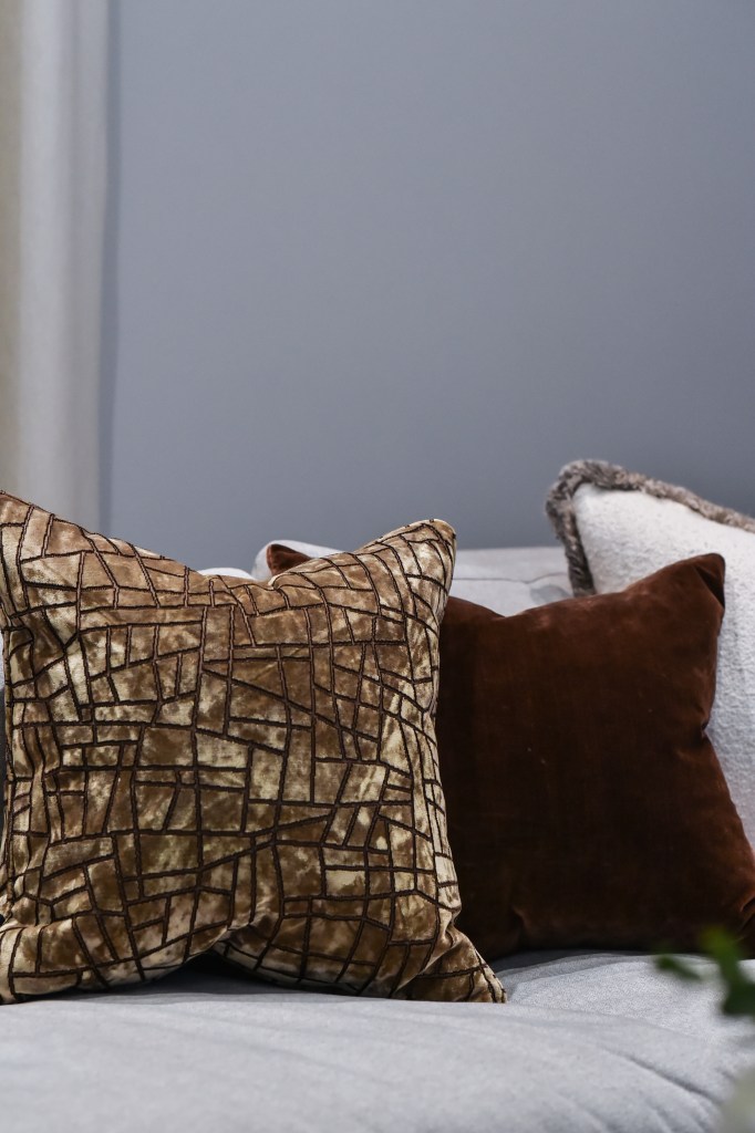 A muted, neutral palette sets the tone, chosen for its calming quality and long-lasting appeal. Against this quiet backdrop, terracotta and gold accents in the cushions introduce warmth and subtle energy, without disturbing the room’s overall stillness.