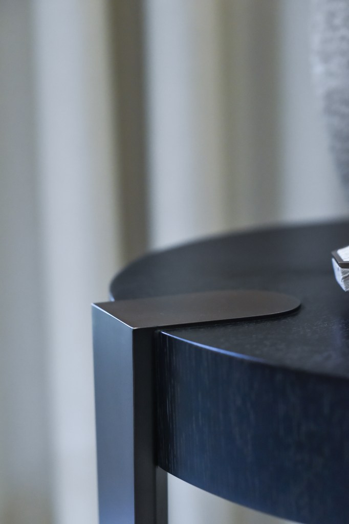 The furniture and decorative items, finished in a wedge wood tone, brings a tactile richness that anchors the space. Brass detailing, stone and dark bronze metalwork offer contrast — not loud, but intentional — adding depth and a quiet sense of luxury. These finishes complement each other, creating harmony between material and tone.