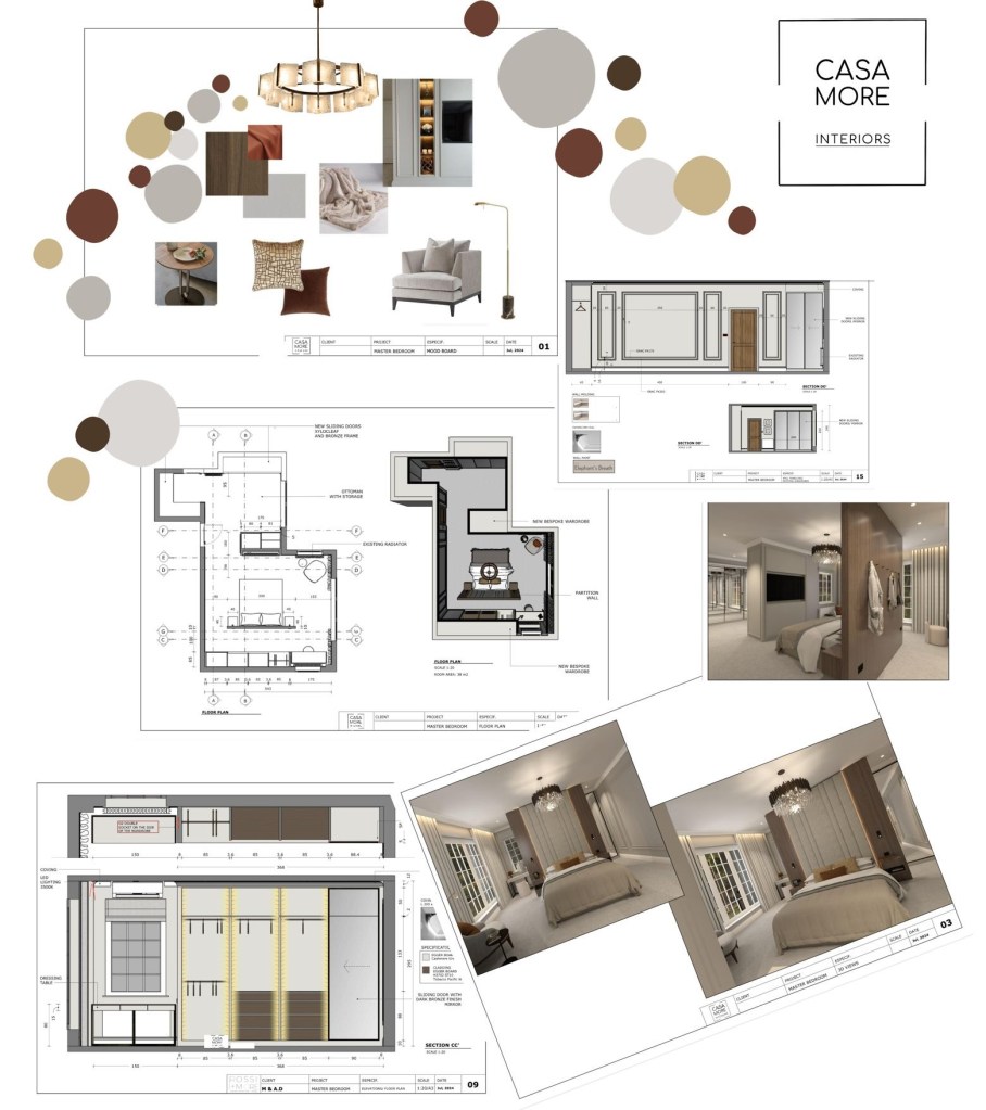 Our design process begins by transforming your vision into a clear and cohesive concept. We create detailed mood boards that capture the space’s essence, accompanied by precise floor plans outlining layout ideas, furniture placement, and potential structural changes. We provide 3D visuals to bring the design to life, showcasing furniture, textures, colour palettes, and lighting, helping clients visualize the space in its whole dimension.